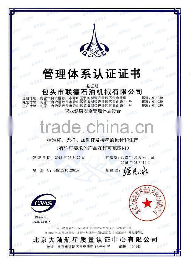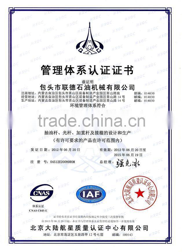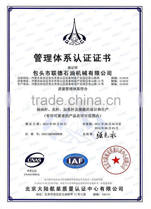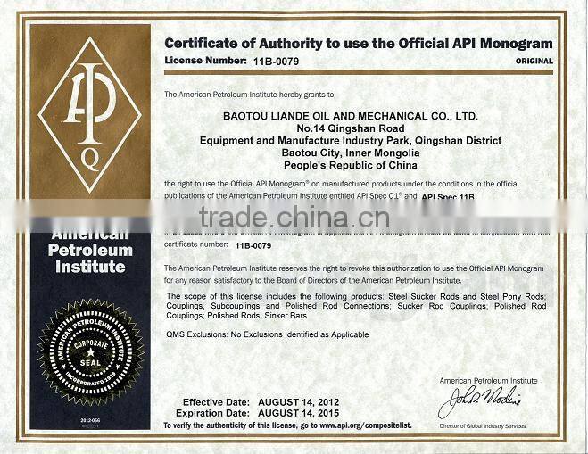 Baotou Liande Oil and Mechanical Co., Ltd. was established in 2004, located in Baotou City, Inner Mongolia, People's Republic of China. We are specialized in manufacturing sucker rod, polished rod, sucker rod coupling, polished rod coupling, sub-coupling, drive rod, pony rod and sinker bar, sucker rod guide which are mainly used in extracting oil system. At present, our factory is about 60,000 square meters and we have more than 130 workers including 3 professional engineers, with advanced equipment, machines and an independent laboratory. We have the annual productivity of more than 5 million meters of high quality sucker rod. All the sucker rod, polished rod and other products are manufactured strictly as per API 11B Spec unless customers have other special requirements. We got the Certificate of Authority to use Official API Monogram in 2006, and we obtained National Industrial Production Permit and ISO9001 Certificate in 2005, then got ISO28001 and ISO14001 in 2012. With an experienced and professional team, we are one of the first three suppliers of CNPC and Sinopec. We make up a big market share in Yanchang Oilfield. Meantime, we have exported our products to many countries and regions all over the world, especially North America, South America and Southeast Asia. Our products enjoy a good reputation among our customers. We welcome customers, business associations and friends from all parts of world to contact us and seek cooperation for mutual benefits.
